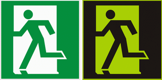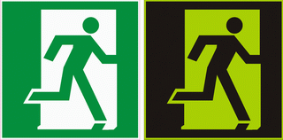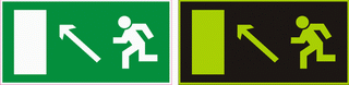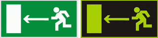 | Выход здесь (левосторонний) | Над дверями (или на дверях) эвакуационных выходов, открывающихся с левой стороны. На стенах помещений вместе с направляющей стрелкой для указания направления движения к эвакуационному выходу |