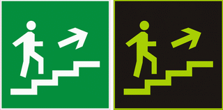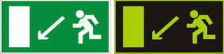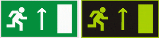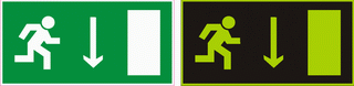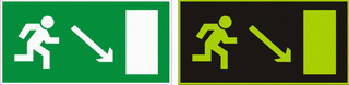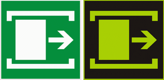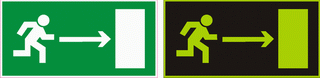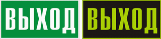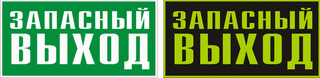 | Выход здесь (правосторонний) | Над дверями (или на дверях) эвакуационных выходов, открывающихся с правой стороны. На стенах помещений вместе с направляющей стрелкой для указания направления движения к эвакуационному выходу |