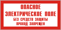 | Для предупреждения об опасности воздействия ЭП на персонал и запрещения передвижения без средств защиты | Красные буквы на белом фоне. Кант белый шириной 1,25 мм. Кайма красная шириной 10 мм. | В ОРУ напряжением 330 кВ и выше. Устанавливается на ограждениях участков, на которых уровень ЭП выше допустимого: |