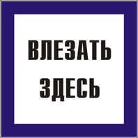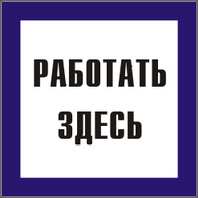 | Для указания рабочего места | Белый квадрат стороной 200 или 80 мм на синем фоне. Кант белый шириной 1,25 мм. Буквы черные внутри квадрата. | В электроустановках электростанций и подстанций. Вывешивают на рабочем месте. В ОРУ при наличии защитных ограждений рабочего места вывешивают в месте прохода за ограждение |